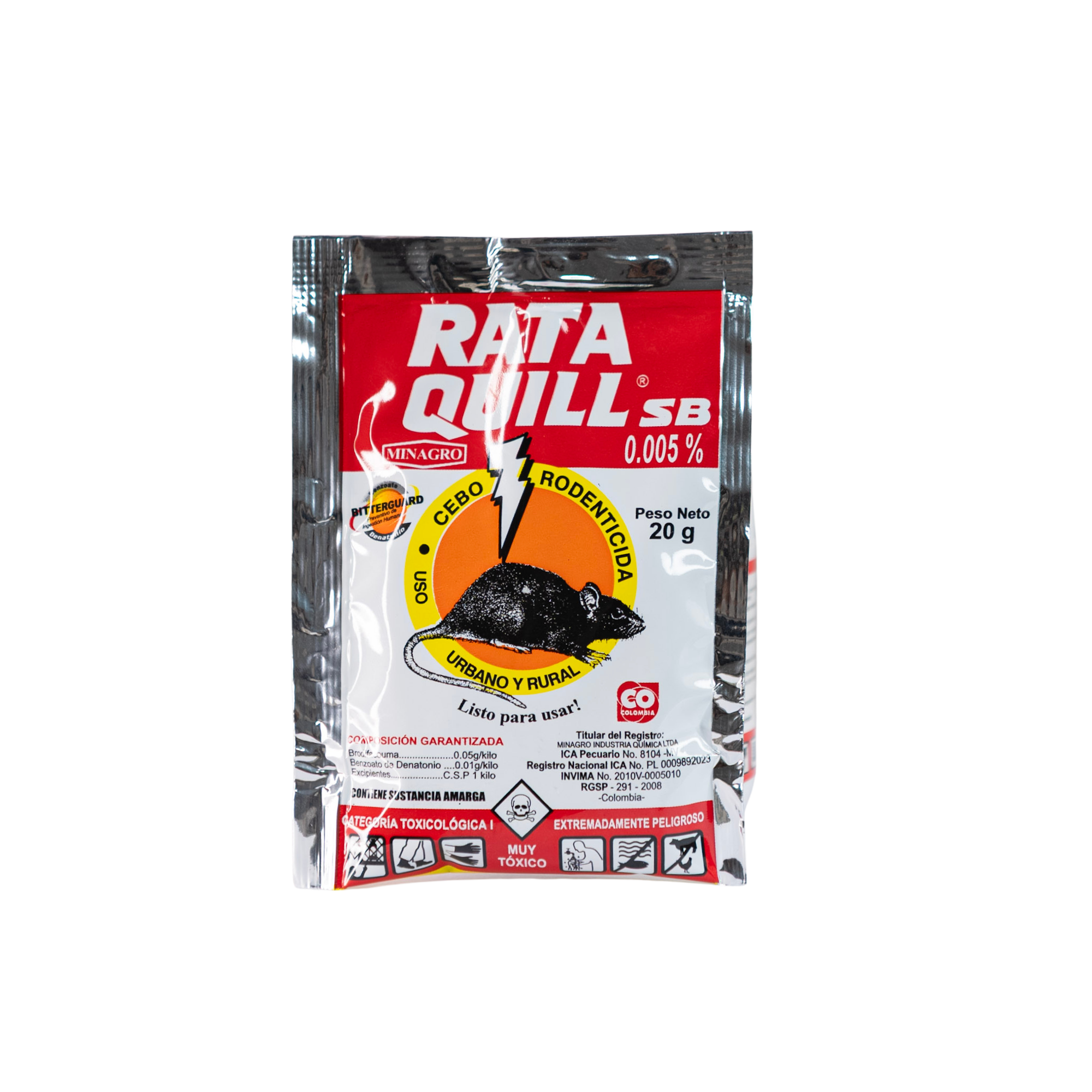 Este cebo rodenticida en forma de pellet está formulado con Brodifacouma al 0.005%, un potente anticoagulante que causa la muerte de ratas y ratones por hemorragias internas entre 2 y 3 días después de la ingestión. Su fórmula de grado alimenticio, elaborada a base de proteínas, cereales y grasas, se adapta perfectamente a la dieta de los roedores, lo que asegura una rápida y efectiva ingestión. Listo para usar, no requiere mezclas ni aditivos, y presenta una palatabilidad superior, especialmente efectiva para roedores del trópico. El producto se ofrece en prácticas bolsas de 10 gramos, ideales para su uso en cualquier tipo de ambiente. Además, incorpora la tecnología BitterGuard®, una sustancia amarga que previene la ingestión accidental por parte de humanos y animales domésticos, sin afectar su eficacia en el control de plagas.